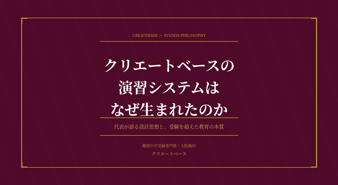 クリエートベースの演習システムは、教育の専門家が理論から設計したものではありません。経営者家系に生まれ、自らすべての入試を経験し、起業後に息子たちの中学受験という現実に直面した代表が、「既存のシステムには根本的な欠陥がある」という確信のもとに一から構築したものです。息子たちを灘中学校に合格させることで実証し、開校後もデータをもとに改良を重ねてきた——その設計思想と経緯を、代表自身の言葉でお伝えします。